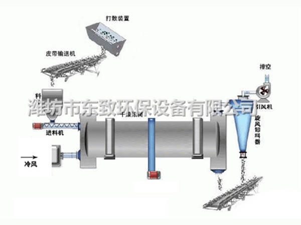 冷却器圆筒是一个与水平线略成倾斜的旋转圆筒。物料从较高一端加入,载热体由低端流出,与物料成逆流接触,也有载热体和物料一起并流进入筒体的。随着圆筒的转动物料受重力作用运行到较底的一端。湿物料在筒体内向前移动过程中,直接或间接得到了载热体的给热,使热物料得以冷却,然后在出料端经皮带机或螺旋输送机送出。